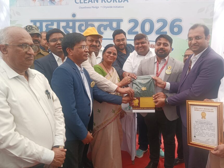 NOW HINDUSTAN. Korba. कोरबा नगर ने ऐतिहासिक 15563 हस्ताक्षर के साथ गोल्डन बुक में अपना नाम दर्ज करा एक नया कीर्तिमान बनाया हैं। इस अवसर पर कोरबा नगर निगम महापौर श्रीमती संजूदेवी राजपूत ने हर्ष व्यक्त करते हुए कहा कि यह उपलब्धि नगर निगम आयुक्त आशुतोष पांडेय के सतत प्रयासों, उनके नेतृत्व में नगर पालिक निगम कोरबा की पूरी टीम की अथक मेहनत और कोरबा के जागरूक नागरिकों के स्वस्फूर्त सहयोग का परिणाम है।