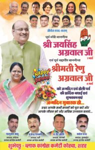 NOW HINDUSTAN. Korba. जनसेवा एवं विकास के प्रति समर्पित पूर्व कैबिनेट मंत्री जयसिंह अग्रवाल एवं श्रीमती रेणु अग्रवाल के जन्मदिवस के अवसर पर पूरे शहर में बधाइयों का तांता लग रहा। शहर भर में पोस्टर से पट दिया गया है। समर्थकों, जनप्रतिनिधियों एवं सामाजिक कार्यकर्ताओं ने उन्हें शुभकामनाएं प्रेषित करते हुए उनके दीर्घायु एवं स्वस्थ जीवन की कामना की। पोस्टर एवं बधाई संदेशों में दोनों नेताओं की जनहित के प्रति प्रतिबद्धता और विकास कार्यों में उनकी सक्रिय भूमिका को रेखांकित किया गया है। संदेश में उल्लेख किया गया है कि आप दोनों का जनसेवा के प्रति समर्पण एवं नगरहित में निरंतर प्रयास समाज के लिए प्रेरणादायक है। ईश्वर से प्रार्थना की गई है कि वे आपको उत्तम स्वास्थ्य, दीर्घायु एवं सतत यश-कीर्ति प्रदान करें।
