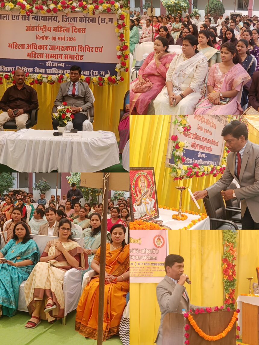 NOW HINDUSTAN. Korba. माननीय उच्च न्यायालय बिलासपुर (छत्तीसगढ़), राष्ट्रीय विधिक सेवा प्राधिकरण, नई दिल्ली एवं छत्तीसगढ़ राज्य विधिक सेवा प्राधिकरण बिलासपुर के निर्देशानुसार दिनांक 08 मार्च 2026 को ‘अंतर्राष्ट्रीय महिला दिवस के अवसर पर जिला न्यायालय कोरबा एवं जिला विधिक सेवा प्राधिकरण कोरबा के संयुक्त तत्वाधान में माननीय प्रधान जिला एवं सत्र न्यायाधीश / अध्यक्ष जिला विधिक सेवा प्राधिकरण कोरबा (छ०ग०) श्री संतोष कुमार शर्मा के नेतृत्व में महिला अधिकार जागरूकता कार्यकम व गहिला सम्मान समारोह का आयोजन किया गया।
