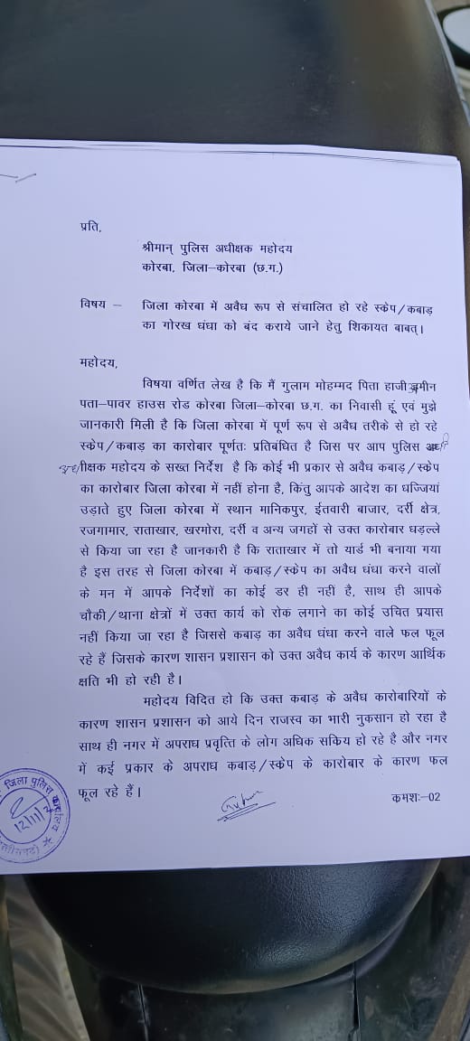 NOW HINDUSTAN korba. जिले में बड़े पैमाने पर कबाड़ का कारोबार खुलेआम चल रहा है जिसे लेकर समाज सेवी गुलाम मोहम्मद पिता हाजी जमीन ने कोरबा पुलिस अधीक्षक को शिकायत…