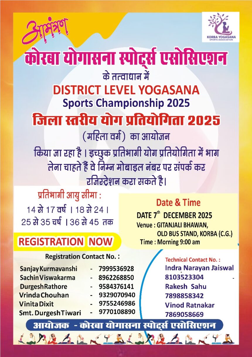 NOW HINDUSTAN. Korba. कोरबा योगासना स्पोर्ट्स एसोसिएशन जिला कोरबा द्वारा 7 दिसंबर रविवार को आयोजित होने वाली जिला स्तरीय महिला योगासन स्पोर्ट्स चैंपियनशिप की तैयारी तेज़ हो गयी हैं। शहर…