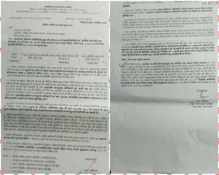 सूचना अधिकार के तहत छत्तीसगढ़ राज्य सूचना आयोग की सख़्त कार्यवाही – ग्राम पंचायत पेलमा के सचिव को तलब, जवाबदेही तय करने के निर्देश……