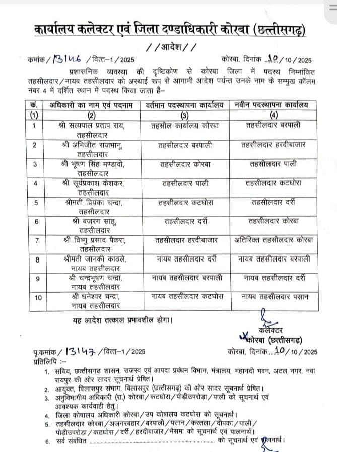 NOW HINDUSTAN. KORBA. कोरबा जिले में प्रशासनिक फेरबदल करते हुए कोरबा। कलेक्टर अजीत बसंत ने तहसीलदारों के तबादले का आदेश जारी किया है। इस ट्रांसफर सूची में कई तहसीलदारों को…