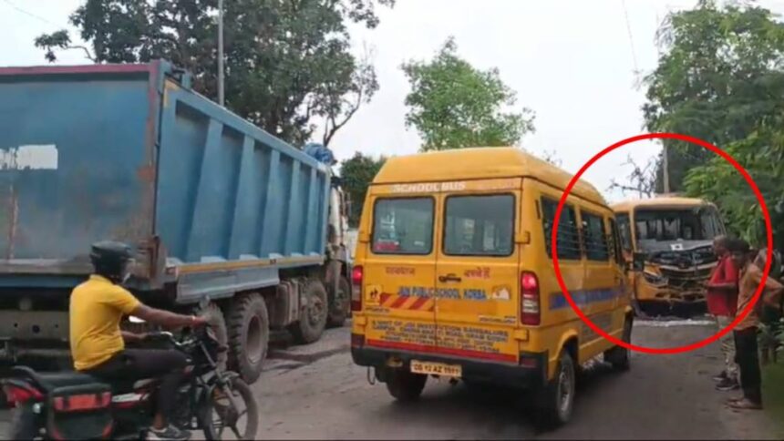 स्कूल बस और हाईवा की हुई टक्कर में बस चालक, परिचालक घायल, आधा दर्जन स्कूली छात्रों को भी आई मामूली चोटें….